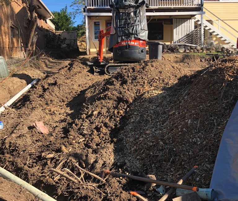 Down 2 Earth started from 2 residential earthworks projects in 2022, that we invested in for our return to Australia in The Gap, Brisbane. With a very hands-on approach to Design we took to tree lopping, large root removal, retaining walls, demolition of a double brick home in The Gap and benching the site ready for builders. Recycling all of the hardwood, roof sheeting and as much as possible was important.